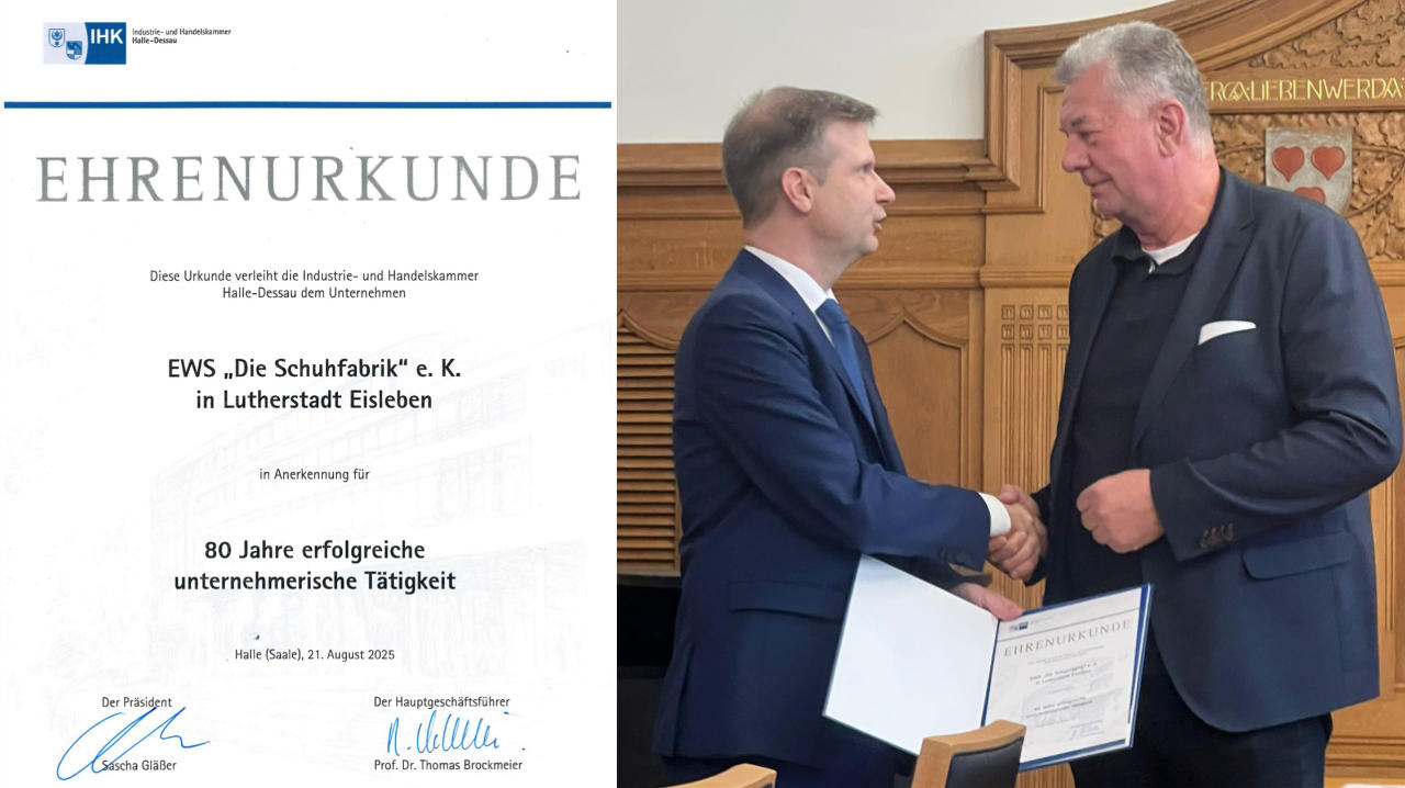 Am 24. September 2025 empfing Inhaber J. Schlichting anlässlich der Vollversammlung der IHK Halle-Dessau aus den Händen von IHK Präsident Gläßer die Ehrenurkunde zu 80 Jahren EWS.